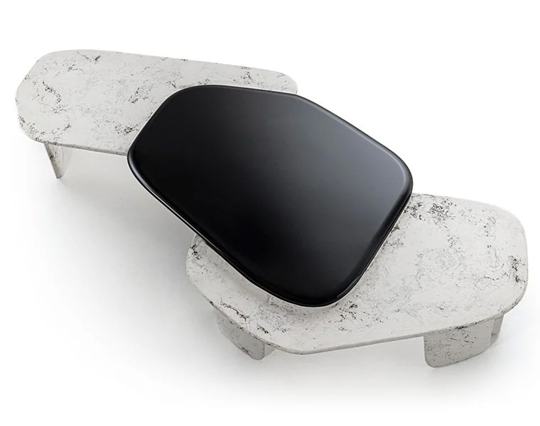 3ピースのセットが連なるThamesコーヒーテーブルは、サステナブルな素材とクラフトマンシップに細心の注意を払うBentley Homeの新しいビジョンを象徴したモデルです。環礁のようなデザインは、ダイナミックにカーブした隙間模様の中に、対照的な芯材が「セット」されています。脚の形も特徴的であり、高級車に見られるようなエレガントな葉脈模様がテーブルトップを飾っています。