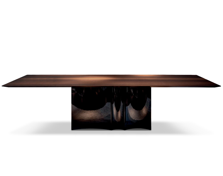 独特なデザインの台座は、荘厳な教会のアーチや列柱をインスピレーションに、モダンな感覚で再解釈された形状となっています。天板の周囲はテーパー加工を施し、ダイナミックかつ上品な存在感を放ちます。 画像の仕様は天板にマット仕上げのユーカリ材、脚部はチョコレート色のラッカー塗装で仕上げています。