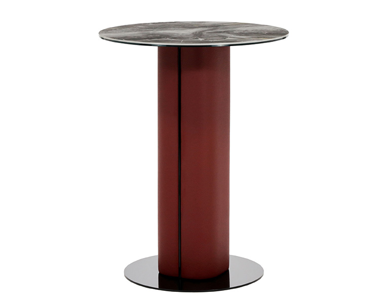 木製ベースの脚部は巧みなディテールを施したレザーにより覆われており、スタイリッシュで美しいデザインに仕上がっています。天板はガラス、セラミック、大理石からお選びいただけます。
