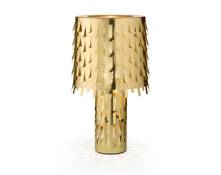 丁寧に磨かれた真鍮でつくられた優雅な卓上ランプです。「ジャックフルーツ」と名付けられたランプは、2つの円筒が重なり合って構成されています。まさに樹木の様なデザインになっており、風によってなびいた幾千の葉っぱをイメージして作られています。その葉っぱの切れ込み部分からは光が漏れ出し、熱帯林の鬱蒼と茂る中を光が通り抜ける様な幻想的な光の反射を生み出します。