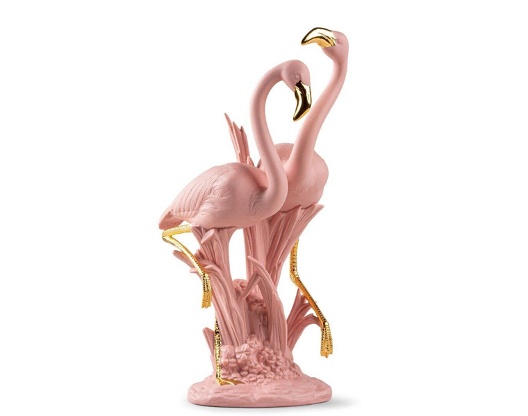 フラミンゴは、最もシルエットの美しい鳥です。名前は「炎」を意味するラテン語「flama」が由来です。その炎のような淡紅色から、古代エジプトでは太陽神ラーの化身と信じられていました。フラミンゴは一般的に長寿の鳥であり、最近の観察研究では、フラミンゴ同士が永続的な友情の絆を結ぶことが明らかにされています。 このシンボリックなフラミンゴをリヤドロのアーティストたちはコンテンポラリーな作品へと昇華しました。「フラミンゴ」のカップルはマットなピンクの磁器で作られ、光沢のあるゴールドカラーをアクセントに効かせています。美しい立ち姿にうっとりする作品です。