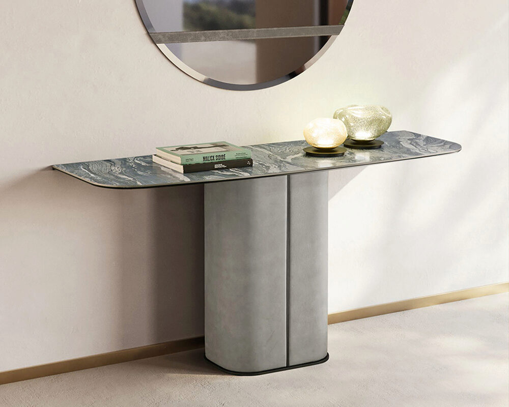 レザーで包み込まれたフォルムと、セラミックや大理石から選べる天板が魅力の「Milos」コンソール。 彫刻のようにモダンで軽やかな佇まいが、空間に上質な陰影を添えます。ガンマ社ならではの素材美とクラフトが光るコンソールです。