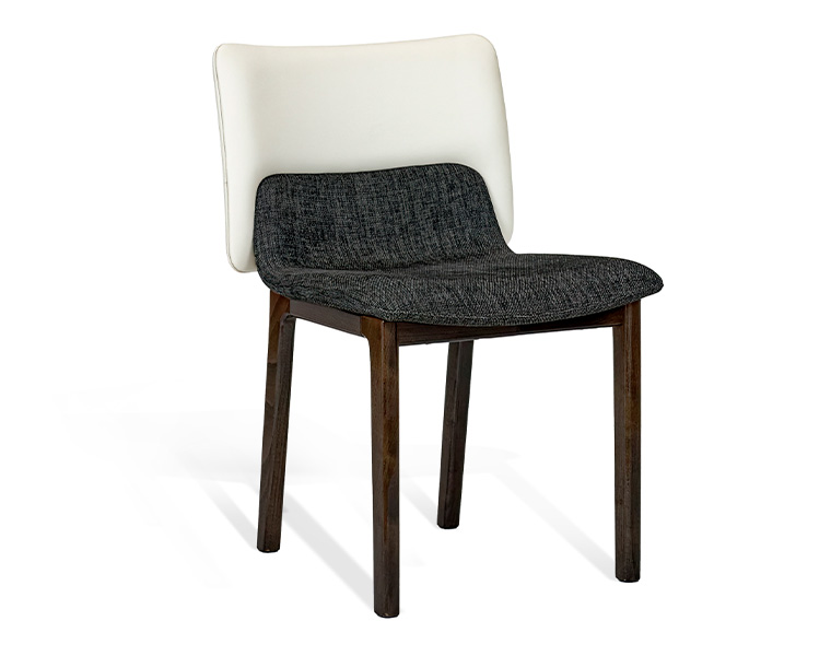 座面から腰回りまで一体で作られた生地張りのシートと、座面よりも広いシェル型の背もたれを合わせた特徴的な椅子です。背もたれの包み込むような形から、柔らかな座面、角をとり丸みを帯びた木製脚部にかけて異なる素材が美しくまとめたられたデザインです。背もたれ、シートは生地張りまたは革張りから、また、脚部のカラーをお選び頂くことで様々なインテリアに合わせた組み合わせ実現します。