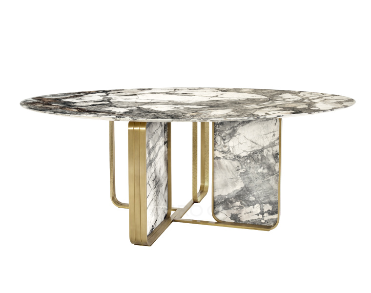 マットライトブロンズの塊で作られる美しい脚部は、鋳型に高温の液体金属を鋳込む伝統方法で作られており、一つひとつがユニークな表情をもつアートピースです。美しい佇まいにブロンズメタルの柔らかな色調と大理石とが響きあう、ブランドを象徴するテーブルです。