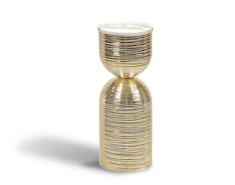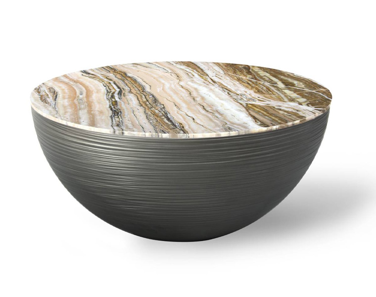 貴重な大理石のトップを支える、マットな彫刻が施された表面を備えた 2 つの半球で構成される金属ベースが特徴です。 さまざまな高さと寸法が用意されており、単品で使用するか、同じコレクションの他のアイテムと合わせて使用することをお勧めします。