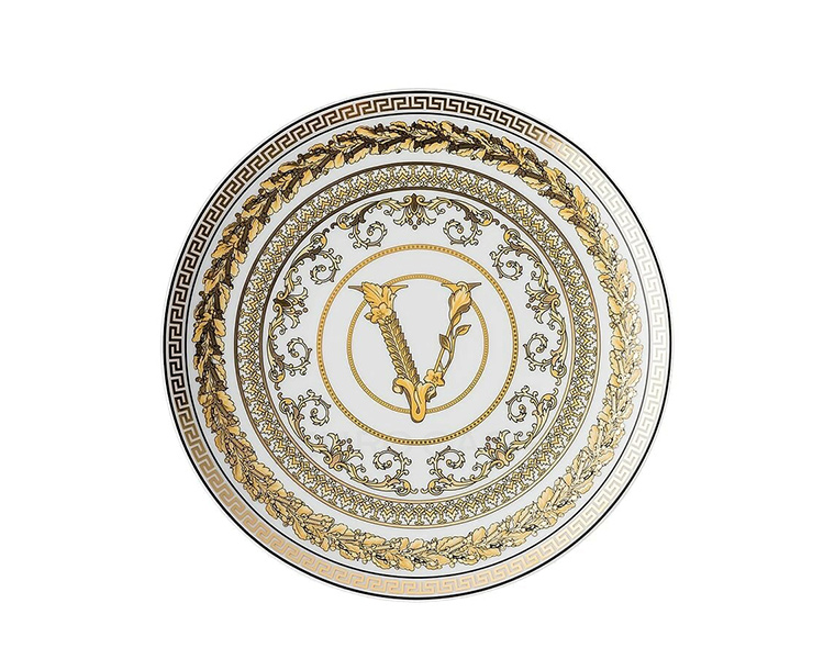 アイコニックなバロック調の“V”を囲むアカンサスの葉が、ギリシャ様式の意匠のように描かれています。